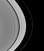 Prometheus (102 kilometers, or 63 miles across) is more or less obvious just inside the perturbed F ring. But in the Keeler Gap, just inside the bright A ring edge, lurks Daphnis (7 kilometers, or 4.3 miles across). The tiny moon and its attendant waves in the gap edges create a slight brightening of the gap at center.