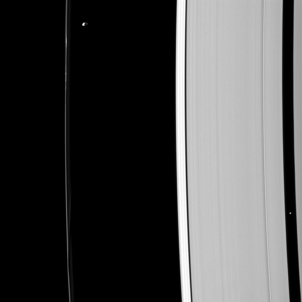 Pan (17 miles,or 28 kilometers across), near the right edge of the image, holds open the Encke gap that it orbits in. Prometheus (53 miles, or 86 kilometers across), near the upper left, helps shape the F ring and maintain its narrow form.