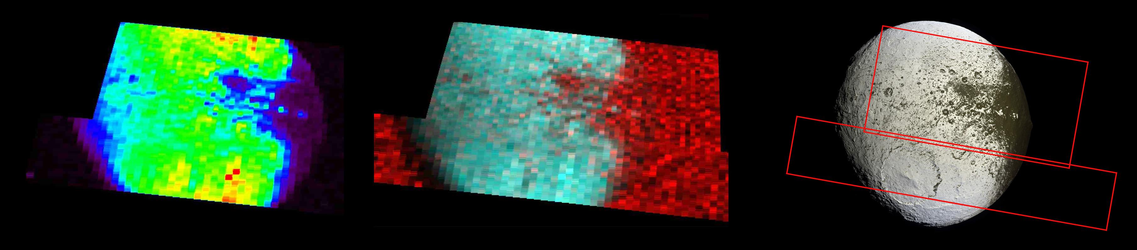 The middle image is a color composite: blue-green (longer ultraviolet wavelengths) indicates where the surface is bright and probably richest in water ice. Red (short ultraviolet wavelengths) indicates where the surface is low in water ice and relatively high in dirty material. The sky background is also bright at these wavelengths, making the limb, or edge, of Iapetus where the surface is dark indistinguishable from the sky background.