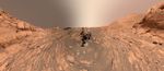 The rock structure behind the rover is "Greenheugh Pediment"; the hill that is middle distance on the right, is "Rafael Navarro Mountain." Curiosity is headed toward "Maria Gordon Notch," the U-shaped opening behind the rover to the left.