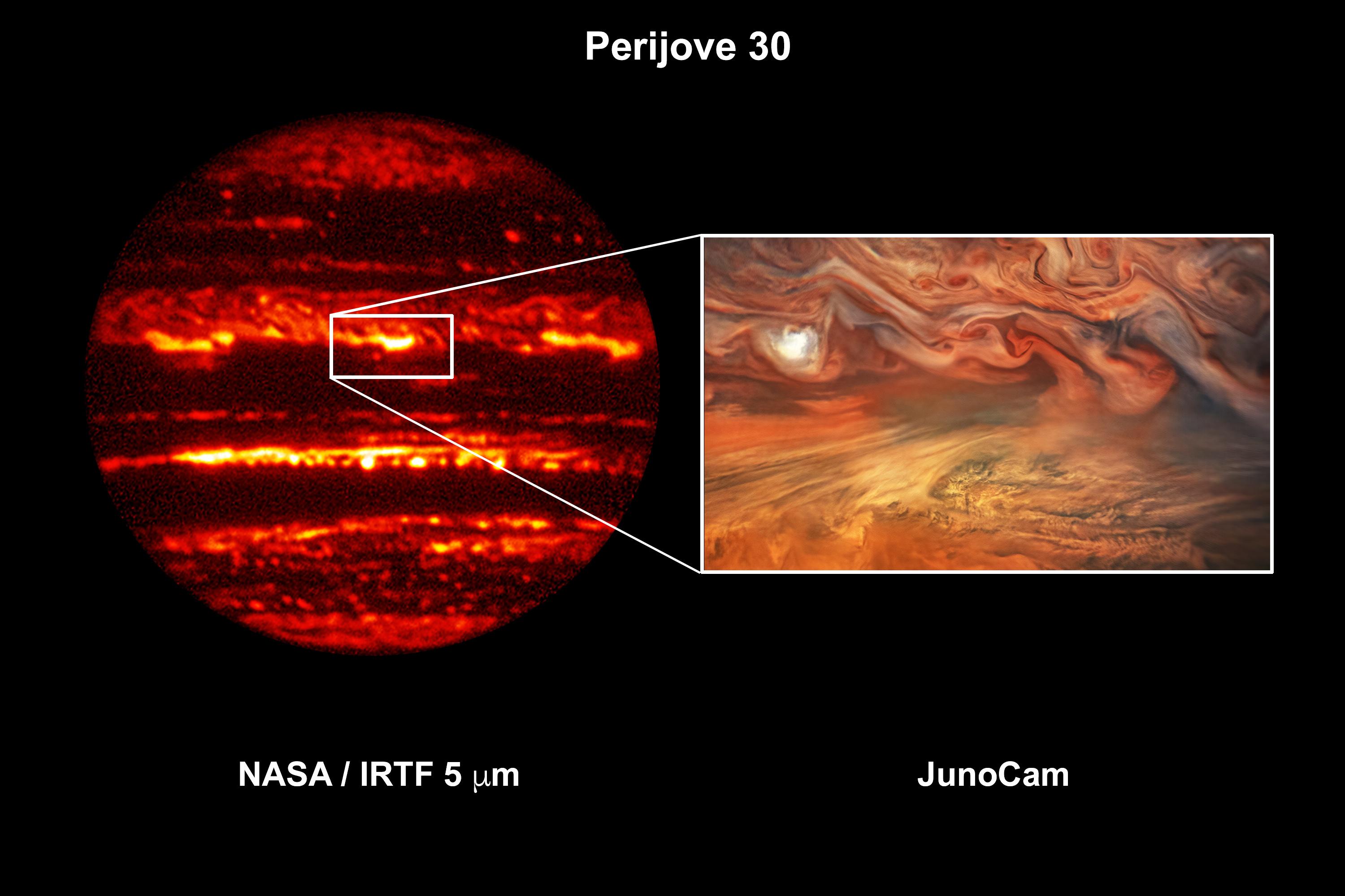 This composite image shows a hot spot in Jupiter's atmosphere. In the image on the left, taken on Nov. 8, 2020, by NASA's Infrared Telescope Facility (IRTF) on the island of Hawaii, the hot spot appears bright in the infrared. The inset image on the right, taken by the JunoCam visible-light imager (also on Nov. 8, during Juno's 30th perijove pass), the hot spot appears dark and is flanked by high light-colored clouds to the south and a bright white storm to the west.