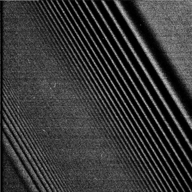 This image shows a bending wave (right) and density wave in Saturn's A ring, interior to the Encke Gap. It was taken by the narrow angle camera on the Cassini spacecraft after successful entry into Saturn's orbit. The view shows the dark, or unlit, side of the rings.