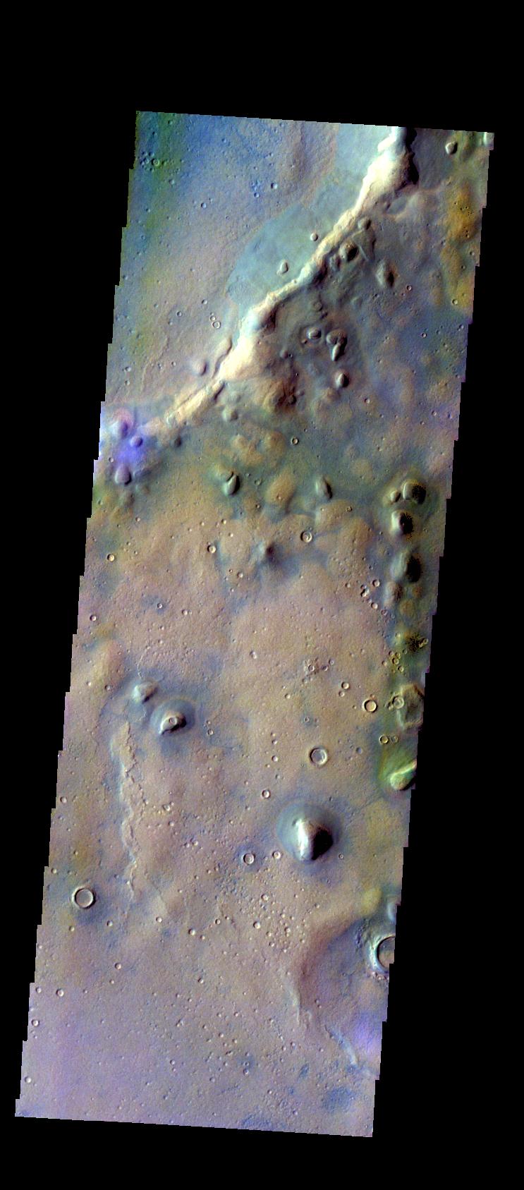 The THEMIS VIS camera contains 5 filters. The data from different filters can be combined in multiple ways to create a false color image. These false color images may reveal subtle variations of the surface not easily identified in a single band image. Today's false color image shows part of the rim of Tyndall Crater. Tyndall Crater is located in Arcadia Plainitia. An interesting part of this image is that the blueish material in the crater near the rim is not the same blueish color as the blueish material found in the depressions outside the crater.