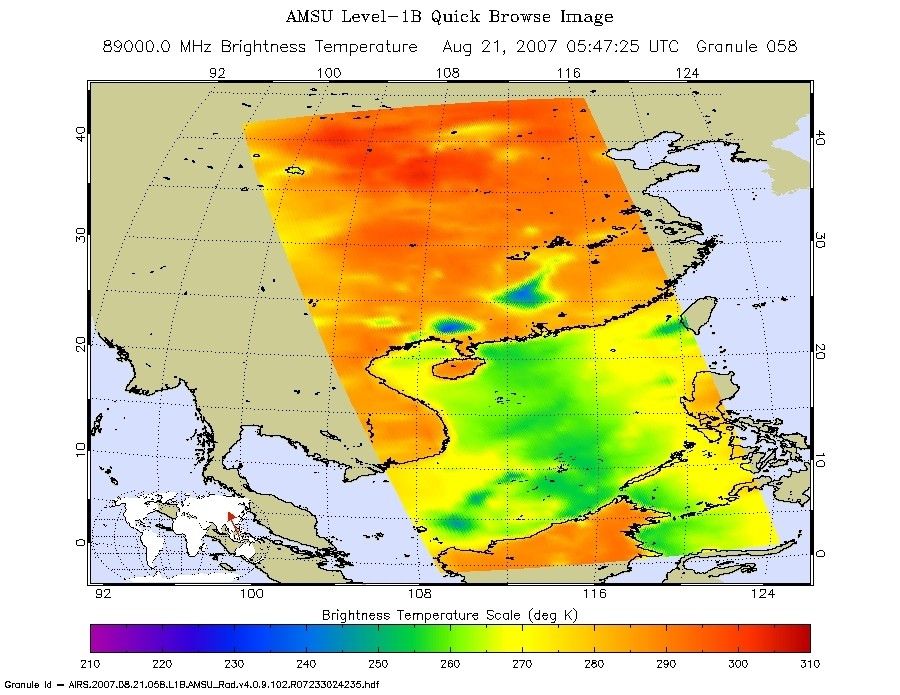 In the AIRS microwave imagery, deep blue areas in storms show where the most precipitation occurs, or where ice crystals are present in the convective cloud tops. Outside of these storm regions, deep blue areas may also occur over the sea surface due to its low radiation emissivity. On the other hand, land appears much warmer due to its high radiation emissivity.