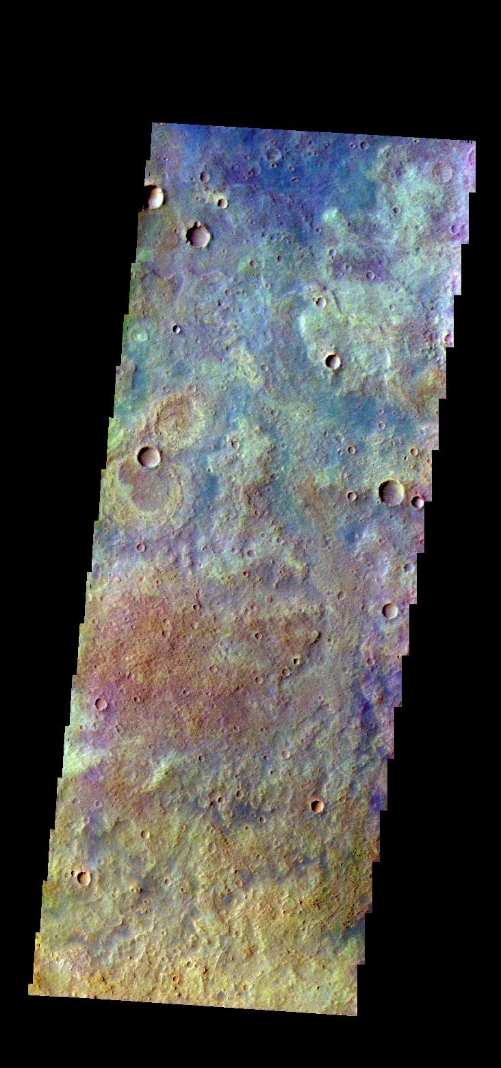 The THEMIS VIS camera contains 5 filters. The data from different filters can be combined in multiple ways to create a false color image. These false color images may reveal subtle variations of the surface not easily identified in a single band image. Today's false color image shows part of the plains of Tyrrhena Terra.
