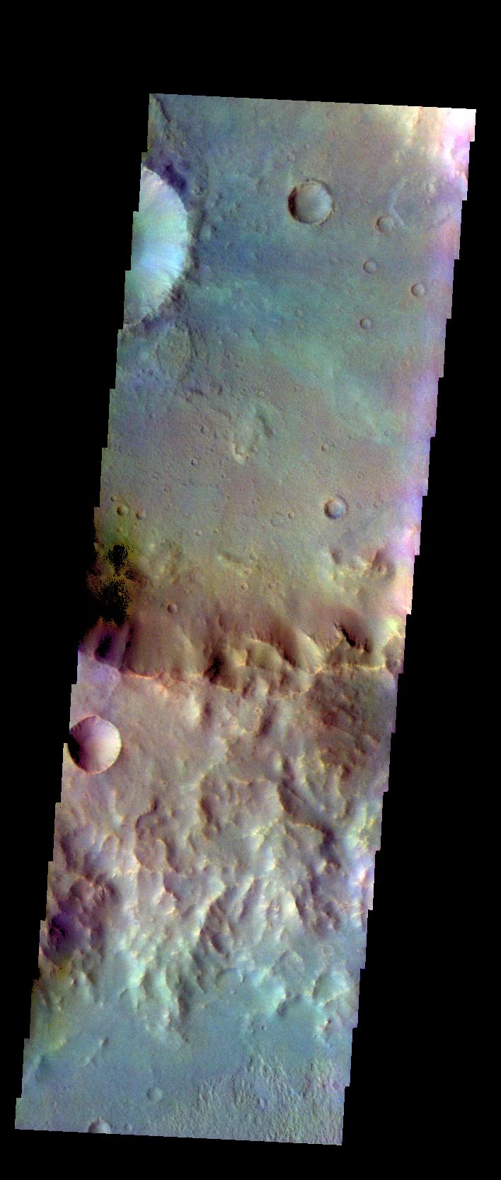 The THEMIS VIS camera contains 5 filters. The data from different filters can be combined in multiple ways to create a false color image. These false color images may reveal subtle variations of the surface not easily identified in a single band image. Today's false color image shows a rim of material between two unnamed craters in Tyrrhena Terra.