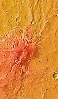 Today's VIS image crosses part of the flank of Tyrrhenus Mons. Tyrrhenus Mons is one of the oldest martian volcanoes. Unlike most of the other Martian volcanoes, it is made of layers that include softer volcanic ash rather than just basaltic flows. This difference is evident in how the volcano is being eroded, creating broad intersecting sinuous channels. Tyrrhena Fossae, the largest of the channels dissecting the volcano, is visible in this image.