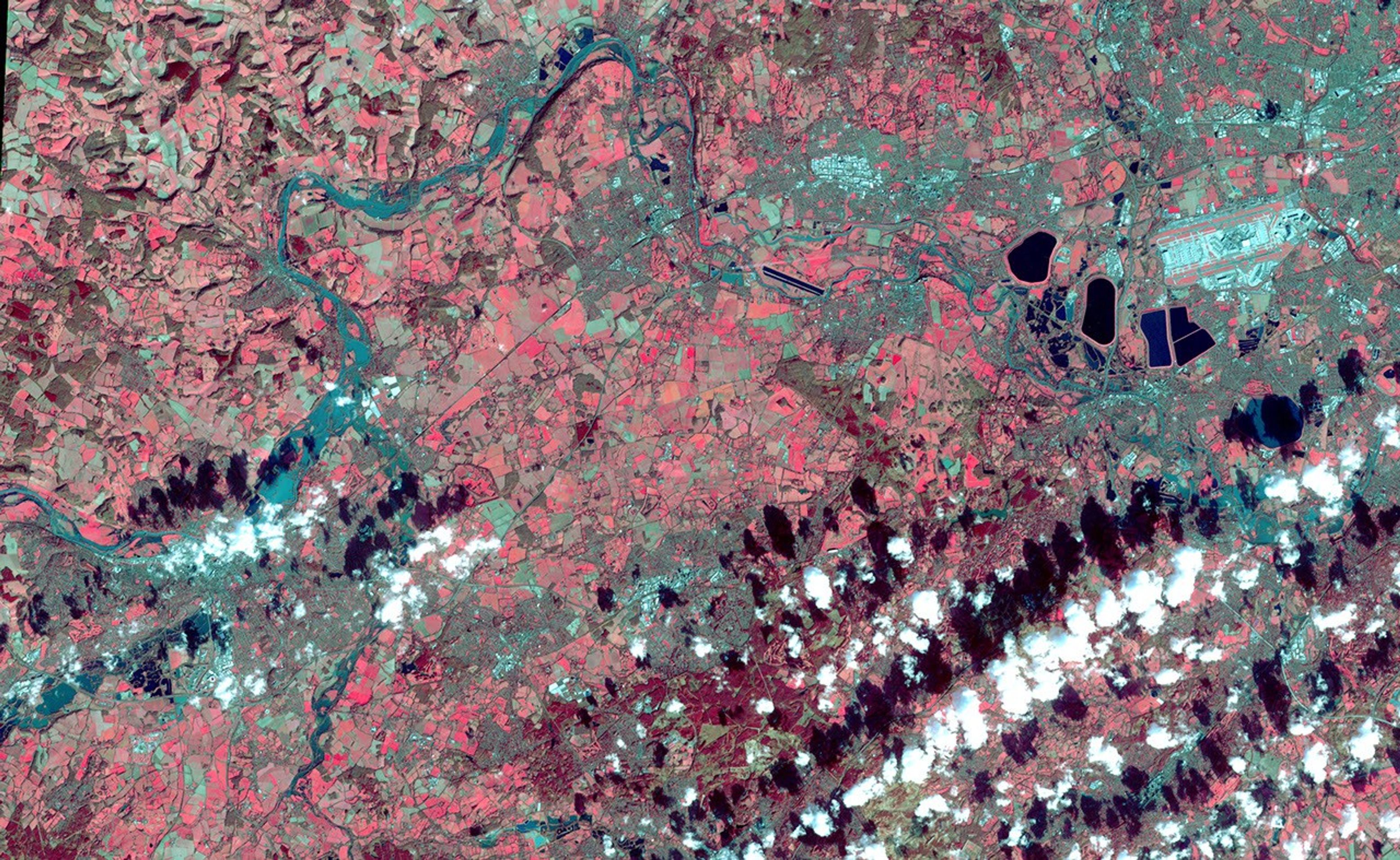 On Feb. 17, 2014, the United Kingdom Environment Agency had issued flood warnings for the area from Walton-on-Thames in the east to Reading in the west, as depicted in this image acquired by the Advanced Spaceborne Thermal Emission and Reflection Radiometer (ASTER) instrument on NASA's Terra spacecraft on Feb. 16, 2014. High water levels and flooding along the Thames River west of London were part of a larger picture of devastation throughout southwest England and Wales, as record-breaking rains covered the United Kingdom in January and February. In this image, vegetation is red; clouds are white and their shadows are black; the Thames River flows across the image in dark cyan color. The image covers an area of 17.7 by 28.5 miles (28.5 by 46 kilometers), and is located near 51.5 degrees north, 0.7 degrees west.
