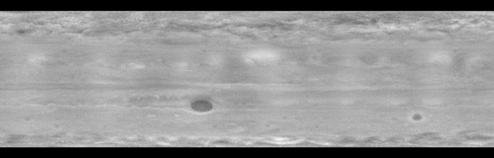 Compared with familiar visible-light views of Jupiter, this image is missing lower-latitude horizontal stripes of dark and light bands of clouds. (See, for example, PIA02867.) Haze in Jupiter's upper atmosphere, or stratosphere, scatters and reflects ultraviolet wavelengths, but is transparent in the visible-light portion of the spectrum.