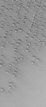 This Mars Global Surveyor (MGS) Mars Orbiter Camera (MOC) image shows dunes covered with a seasonally-deposited layer of solid carbon dioxide (CO2) in the north polar region of Mars. The dark spots indicate areas where the CO2 frost has begun to change, either by being sublimed away, or by becoming rougher or coarser-grained, such that it appears darker than surrounding frost. Over the course of the spring season, the frost will be completely removed and the dark sands that make up the dune field will be visible by summer.