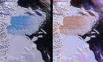 In the left-hand view, spectral variations across the scene are highlighted by using near-infrared, red and blue data from MISR's nadir (vertical-viewing) camera. Here, the ice within the disintegrating ice shelf appears vibrant blue. Water has an intrinsic blue color due to the selective absorption of longer wavelengths such as red and infrared, and the translucent properties of ice within the collapsing shelf enables this absorption to be observed. The use of the near-infrared band within this false-color composite accentuates the effect. Light brownish streaks across the splintering sheet can also be discerned, and probably indicate regions where rocks and morainal debris were exposed from the interior of the shelf.