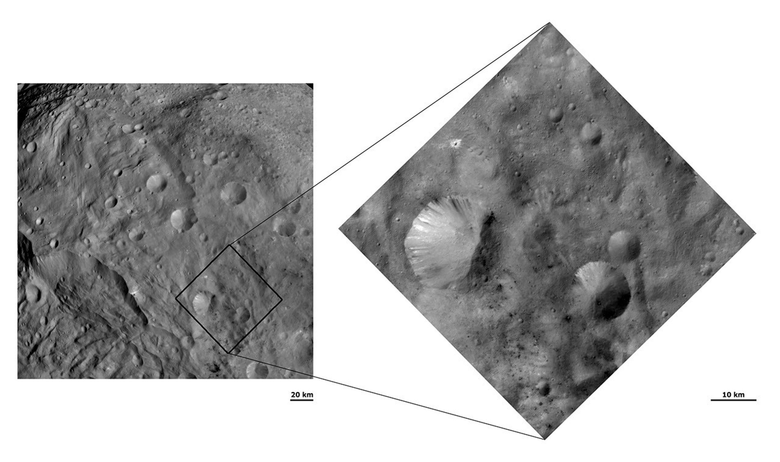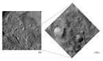 These Dawn FC (framing camera) images show craters with both sharp and smooth crater rims in Vesta's southern hemisphere. The left image has a much wider field of view than the right image and displays the craters with both sharp and smooth rims in the bottom right of the image. Most of the other craters in this image either have sharp or smooth rims. The detailed structure of the sharp and smooth rimmed craters is seen in the right image, which has a smaller field of view and a higher resolution than the left image. Landsliding seems to be occurring on the smooth rims, which results in them losing a definite sharp rim. Dark and bright material is also seen slumping into the craters from their rims.