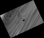 A conical mound partway down the slope stands approximately 40 meters (130 feet) high. One possible explanation for this unusual mound is that it may be the remnant of a buried impact crater now being exhumed. As the north polar layered deposits accumulated, impacts occurred throughout their surface area, then the impact craters were buried by additional ice. These buried craters are generally inaccessible to us, but, in a few locations, erosion that forms a trough (like this one) can uncover these buried structures. For reasons poorly understood, the ice beneath the site of the crater is more resistant to this erosion, so when material is removed by erosion the ice beneath the old impact site remains, forming this isolated hill.
