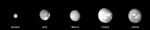 This "family portrait" of Uranus' five largest moons was compiled from images sent back Jan. 20, 1986, by the Voyager 2 spacecraft. The pictures were taken through a clear filter from distances of 5.0 million to 6.1 million kilometers (3.1 million to 3.8 million miles). In this comparison, we see the relative sizes and relativities of the satellites. From left, in order of increasing distance from the planet, they are Miranda, Ariel, Umbriel, Titania and Oberon. The two largest, Oberon and Titania, are about half the size of Earth's Moon, or roughly, 1,600 kilometers (1,000 miles) in diameter. Miranda, smallest of the five, has about one-quarter to one-third the diameter. Even in these distant views, the satellites exhibit distinct differences in appearance. On average, Oberon and Titania reflect about 20 percent of the sunlight, Umbriel about 12 percent, Ariel and Miranda about 30 percent. Ariel shows the largest contrast on its surface, with the brightest areas about 25 percent. All five satellites show only slight color variations on their surfaces, with their average color being very nearly gray. The best views of the satellites will be obtained Jan. 24, the day of closest approach. The Voyager project is managed for NASA by the Jet Propulsion Laboratory.