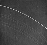 Voyager 2 returned this picture of the Uranus rings on Jan. 22, 1986, from a distance of 2.52 million kilometers (1.56 million miles). All nine known rings are visible in this image, a 15-second exposure through the clear filter on Voyager's narrow-angle camera. The rings are quite dark and very narrow. The most prominent and outermost of the nine, called epsilon, is seen at top. The next three in toward Uranus -- called delta, gamma and eta -- are much fainter and more narrow than the epsilon ring. Then come the beta and alpha rings and finally the innermost grouping, known simply as the 4, 5 and 6 rings. The last three are very faint and are at the limit of detection for the Voyager camera. Uranus' rings range in width from about 100 km (60 mi) at the widest part of the epsilon ring to only a few kilometers for most of the others. This image was processed to enhance these narrow features; the bright dots are imperfections on the camera detector. The resolution scale is approximately 50 km (30 mi). The Voyager project is managed for NASA by the Jet Propulsion Laboratory.