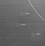 Three of the newly discovered satellites of Uranus are captured in this Voyager 2 image taken Jan. 18, 1986, when the spacecraft was 7.7 million kilometers (4.8 million miles) from the planet. All three lie outside the orbits of Uranus nine known rings, the outermost of which, the epsilon ring, is seen at upper right. The largest of the three moons viewed here, 1986U1, was discovered Jan. 3; it is an estimated 90 km (55 mi) across and orbits Uranus once every 12 hours 19 minutes at a distance of 66,090 km (41,040 mi) from the planet's center. The other two moons are slightly smaller. 1986U3 orbits once every 11 hours 6 minutes at 61,750 km (38,350 mi), 1986U4 every 13 hours 24 minutes at 69,920 km (43,420 mi). They were discovered on Jan. 9 and 13, respectively. Long exposures were required to bring out these small objects; thus, as a result of the relative motions of the spacecraft and the moons, they appear slightly elongated. The Voyager project is managed for NASA by the Jet Propulsion Laboratory.