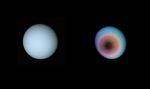 These two pictures of Uranus were compiled from images recorded by Voyager 2 on Jan. 10, 1986, when the NASA spacecraft was 18 million kilometers (11 million miles) from the planet. The images were obtained by Voyager's narrow-angle camera; the view is toward the planet's pole of rotation, which lies just left of center. The picture on the left has been processed to show Uranus as human eyes would see it from the vantage point of the spacecraft. The second picture is an exaggerated false-color view that reveals details not visible in the true-color view -- including indications of what could be a polar haze of smog-like particles. The true-color picture was made by combining pictures taken through blue, green and orange filters. The dark shading of the upper right edge of the disk is the terminator, or day-night boundary. The blue-green appearance of Uranus results from methane in the atmosphere; this gas absorbs red wavelengths from the incoming sunlight, leaving the predominant bluish color seen here. The picture on the right uses false color and contrast enhancement to bring out subtle details in the polar region of the atmosphere. Images shuttered through different color filters were added and manipulated by computer, greatly enhancing the low-contrast details in the original images. Ultraviolet, violet- and orange-filtered images were displayed, respectively, as blue, green and red to produce this false-color picture. The planet reveals a dark polar hood surrounded by a series of progressively lighter convective bands. The banded structure is real, though exaggerated here. The brownish color near the center of the planet could be explained as being caused by a thin haze concentrated over the pole -- perhaps the product of chemical reactions powered by ultraviolet light from the Sun. One such reaction produces acetylene from methane -- acetylene has been detected on Uranus by an Earth-orbiting spacecraft -- and further reactions involving acetylene are known to produce reddish-brown smog-like particles. A similar haze envelopes Saturn's moon Titan; ground-based observations have predicted such a haze in the polar regions of Uranus. The exact identification of the reactions and their products will require additional study. Voyager 2 is heading for a Jan. 24 closest approach to Uranus. The Voyager project is managed for NASA by the Jet Propulsion Laboratory.