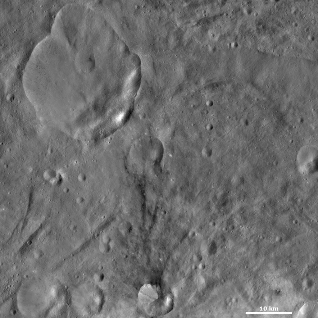 This Dawn Framing Camera (FC) image of Vesta shows Urbinia and Sossia craters. Urbinia is the large crater, which dominates the top left of the image, and Sossia is the small crater surrounded by dark material in the bottom of the image. Urbinia crater is a distinctive crater for many reasons: it has a fresh and very irregularly shaped rim; there is a younger, smaller crater near its center and there are patches of dark and bright material around its rim, which slump towards its center. The quadrangle in which Urbinia is located is named after it because of the individuality of the crater. Sossia crater is much smaller than Urbinia, Sossia is 8 kilometers (5 miles) in diameter and Urbinia is 24 kilometers (15 miles) in diameter. But, it is also an interesting crater because of the dark material associated with it.