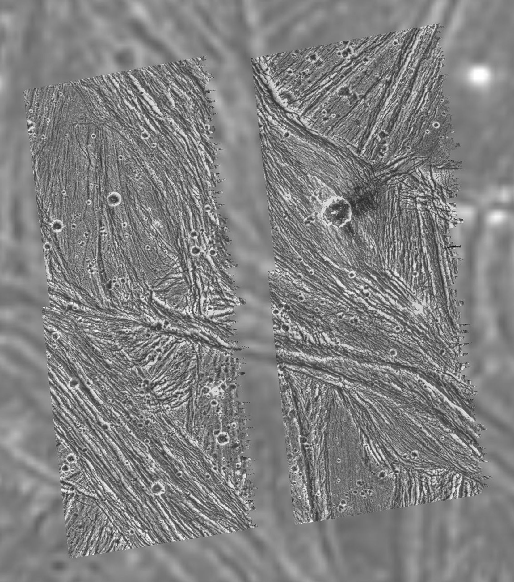 A mosaic of four Galileo images of the Uruk Sulcus region on Ganymede (Latitude 11 N, Longitude: 170 W) is shown overlayed on the data obtained by the Voyager 2 spacecraft in 1979. North is to the top of the picture, and the sun illuminates the surface from the lower left, nearly overhead. The area shown is about 120 by 110 kilometers (75 by 68 miles) in extent and the smallest features that can be discerned are 74 meters (243 feet) in size in the Galileo images and 1.3 kilometers (0.8 miles) in the Voyager data. The higher resolution Galileo images unveil the details of parallel ridges and troughs that are principal features in the brighter regions of Ganymede. High photometric activity (large light contrast at high spatial frequencies) of this ice-rich surface was such that the Galileo camera's hardware data compressor was pushed into truncating lines. The north-south running gap between the left and right halves of the mosaic is a result of line truncation from the normal 800 samples per line to about 540. The images were taken on 27 June, 1996 Universal Time at a range of 7,448 kilometers (4,628 miles) through the clear filter of the Galileo spacecraft's imaging system.