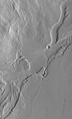 The Mars Orbiter Camera (MOC) on board the Mars Global Surveyor (MGS) spacecraft has been documenting a variety of landforms in the volcanic Tharsis region, including these valleys and associated lava flows on the plains southeast of Olympus Mons. Lava flows are visible in the upper left quarter of this image, but meandering valleys with streamlined "islands" dominate the scene. The valleys might have been carved by running water, but extremely fluid lava or mud might also have flowed through the channels. The exact role of each type of fluid--water, mud, or lava--remains to be determined. Illumination is from the right. The area shown is 7.3 km (4.5 mi) wide by 12 km (7.5 mi) long.