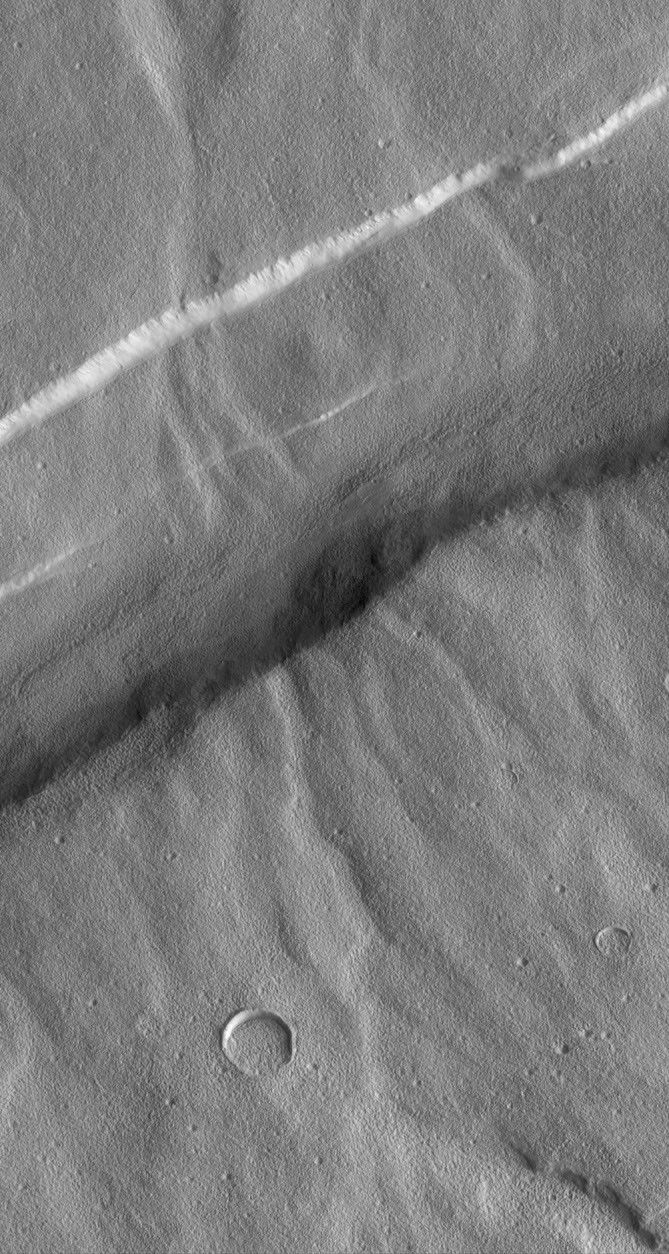 The picture above covers an area approximately 8 kilometers (5 miles) wide by 15 kilometers (9 miles) high. Illumination is from the right. The picture was acquired in August 1998 during the MGS Science Phasing Orbits imaging campaign, and was presented at the 30th Lunar and Planetary Science Conference in Houston, Texas, March 1999.