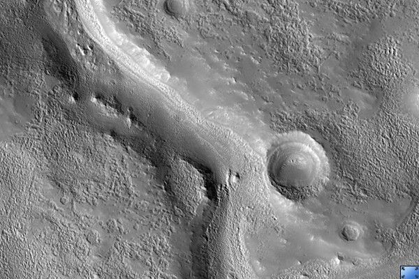 HiRISE image (PSP_003312_2145) reveals valleys that cross the ejecta from the large impact crater Cerulli to the south.