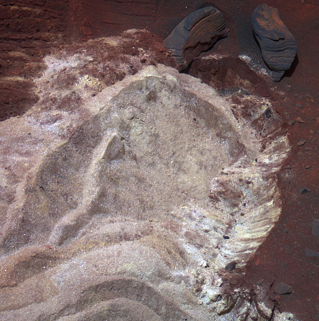 The soft soil exposed when wheels of NASA's Mars Exploration Rover Spirit dug into a patch of ground dubbed "Troy" exhibit variations in hue visible in this image, in which the colors have been stretched to emphasize the differences.