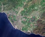 Ventura, California has a coastal site, set against hills and flanked by two rivers. Archaeologists have found remnants of human settlements dating back 10,000 years. When the Spaniards arrived at the end of the 18th century, they found the Chumash people and the Shisholop Village (Wikipedia). In 1782 Junipero Serra founded Mission San Buenaventura. Rich agricultural lands and the more recent discovery of oil led to economic growth. In late 2017, the Thomas Fire spread through the downtown and nearby communities, eventually burning over 270,000 acres. The image was acquired April 27, 2016, covers an area of 28.8 by 34.1 kilometers, and is located at 34.2 degrees north, 119.1 degrees west.