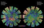 The images used for the base of this globe show the northern and southern hemispheres of Venus as revealed by more than a decade of radar investigations culminating in the 1990-1994 Magellan mission. The Magellan spacecraft imaged more than 98% of Venus at a resolution of about 100 meters; the effective resolution of these images is about 3 kilometers. A mosaic of the Magellan images (most with illumination from the west) forms the image base. Gaps in the Magellan coverage were filled with images from Soviet Venera 15 and 16 spacecraft in the northern quarter of the planet, with images from the Earth-based Arecibo radar in a region centered roughly on 0 degrees latitude and 0 degrees longitude, and with a neutral tone elsewhere (primarily near the south pole). The composite image was processed to improve contrast and to emphasize small features and was color-coded to represent elevation. Gaps in the elevation data from the Magellan radar altimeter were filled with altimetry from the Venera spacecraft and the U.S. Pioneer Venus missions.