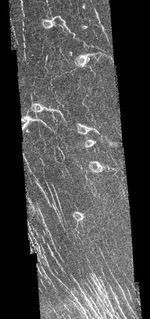 This image is centered at approximately 29.6 degrees south latitude and 341 degrees east longitude in the Lavinia Region of Venus. Volcanic vent areas in this part of the plains west of Alpha Regio consist of domes and pits up to nearly 3 kilometers across. Extending eastward these features are sinuous channels, most of which are about 10 kilometers or more long. The channels narrow away from the pits and for most of their lengths are about 1 kilometer in diameter. The nearest planetary analogues for these features are sinuous rilles on the moon. These have been explained as lava channels and/or the result of lava erosion. On Earth lava channels form by downhill drainage of a lava flow leaving a channel behind. Lava may continue to flow in the channel once it has formed. However, lava channels on Earth are normally only a few meters or tens of meters wide. On the other hand, they may be the result of lava erosion. This is a process that only normally occurs to a limited extent on Earth because melting is inhibited by the cool upper layers of the planet. Also, lavas rarely flow turbulently enough to cause mechanical erosion. On Venus the surface materials are already at high temperatures, thus assisting thermal erosion and it is possible that lavas which may flow turbulently are more readily available than on Earth. Resolution of the Magellan data is about 120 meters (400 feet).