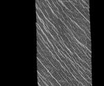 This mosaic shows an area of the Lakshmi region that is located 30 degrees north latitude and 333.3 degrees east longitude. (Longitude on Venus is measured from 0 degrees to 360 degrees east). The area shown measures about 37 kilometers (23 miles) wide and 80 kilometers (50 miles) long. Based on data from the Pioneer Venus Orbiter and the ground-based Arecibo Radar Observatory, it is known that this region is located on the low rise that separates Sedna Planitia and Guinevere Planitia, just to the west of Eistla Regio. Two sets of parallel lineations are seen intersecting almost at right angles. The fainter lineations are spaced at regular intervals of about one kilometer (0.6 mile) and extend beyond the boundary of the image. The width of the faint lineations is at the limit of resolution of the best Magellan images. The brighter, more dominant lineations are less regular and, in places, appear to begin and end where they intersect the fainter lineations. It is not clear whether the two sets of lineations are faults or fractures, but in other Magellan images, these bright lineations are associated with pit craters and volcanic features. This type of terrain has not been seen on Venus nor on other planets. North is at the top of the image.