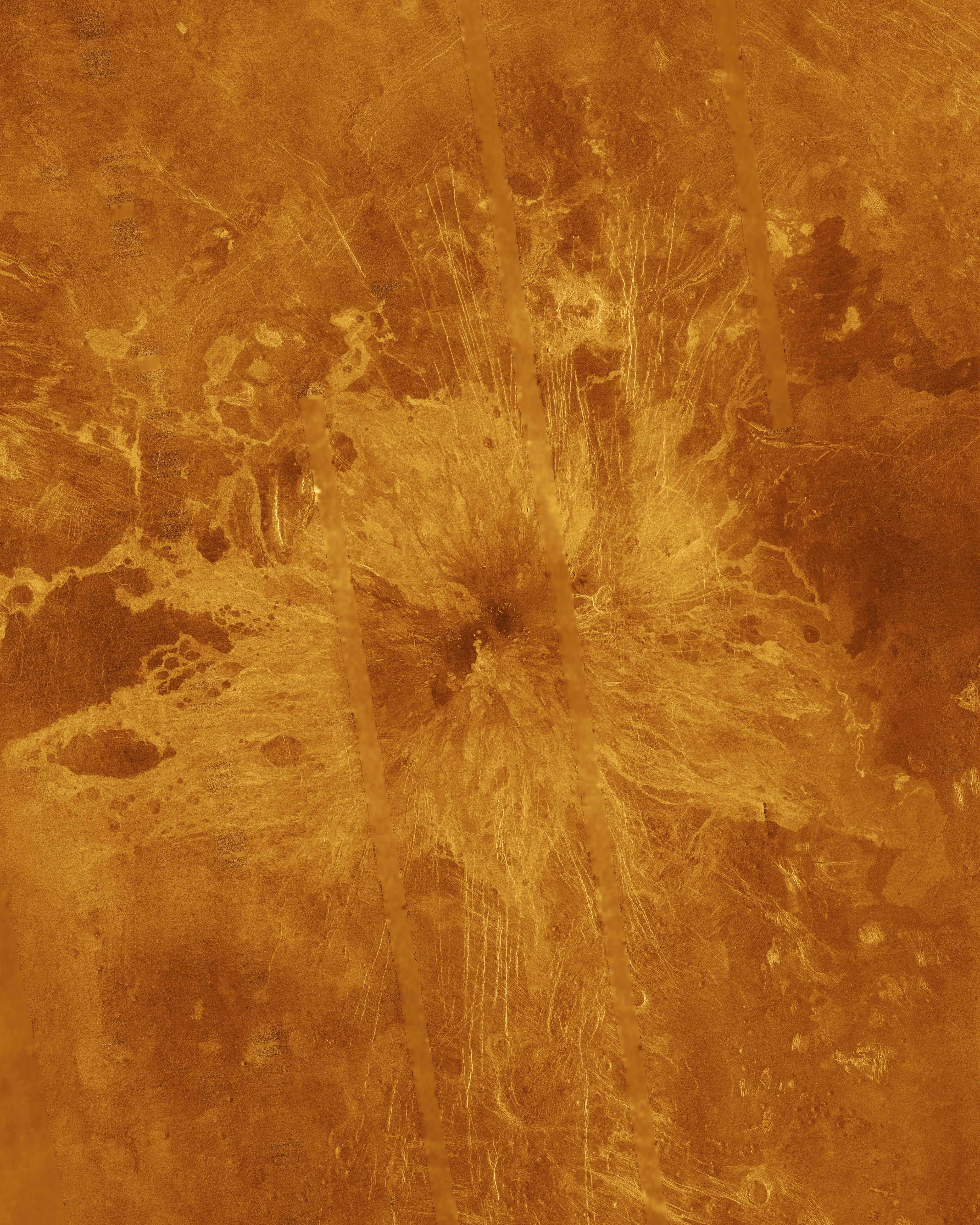 Ushas Mons, a 2-kilometer-high (1.25 mile) volcano in the southern hemisphere of Venus is shown in this Magellan radar image. The image is centered at 25 degrees south latitude, 323 degrees east longitude, and shows an area approximately 600 kilometers (360 miles) on a side. The volcano is marked by numerous bright lava flows and a set of north-south trending fractures, many of which appear to have formed after the lavas were erupted onto the surface. In the central summit area, however, younger flows remain unfractured. An impact crater can be seen among the fractures in the upper center of the image. The association of faulting and volcanism is common on this type of volcano on Venus, and is believed to result from a large zone of hot material upwelling from the Venusian mantle, a phenomenon known on Earth as a "hot spot." Simulated color is used to enhance small-scale structures. The simulated hues are based on color images recorded by the Venera 13 and 14 landing craft. The data were acquired during the third eight-month cycle of Magellan's radar mapping, which ended in September 1992. Several narrow gaps in the Magellan coverage are filled with low-resolution radar data obtained by the Earth-based Arecibo radio telescope. The image was produced by the Solar System Visualization Project and the Magellan Science Team at the Jet Propulsion Multimission Image Processing Laboratory. The Magellan mission is managed by JPL for NASA's Office of Space Science.