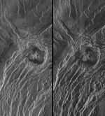 During the third global cycle of Magellan's radar mapping mission, images were obtained at viewing angles that were slightly different than those used in the first two cycles. This strategy was designed to produce stereo image pairs, which take advantage of distortions induced by the different views to provide details of the surface topography. This is a stereo image pair of crater Goeppert-Mayer, named for the 20th Century Polish physicist and Nobel laureate (60 degrees north latitude, 26.5 degrees east longitude). The crater, 35 kilometers (22 miles) in diameter, lies above an escarpment at the edge of a ridge belt in southern Ishtar Terra. West of the crater the scarp has more than one kilometer (0.6 mile) of relief. Perception of relief may be obtained with stereo glasses or a stereoscope. Some individuals may be able to fuse the images without the aid of those devices. The radar illumination for both images is from the west, or left side of the scene. Incidence angles are: (Cycle 1 (left) 28 degrees, Cycle 3 (right) 15 degrees from vertical. Analysis of stereo image pairs allows planetary scientists to resolve details of topographic relationships on Venusian craters, volcanoes, mountain belts and fault zones. The spatial resolution of this topographic information is approximately ten times better than that obtained by Magellan's altimetry experiment.