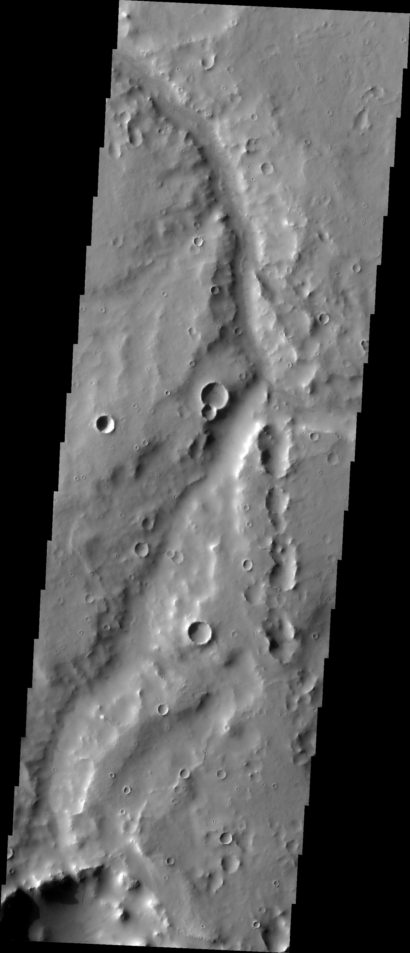 The major Martian dust storm of 2007 filled the sky with dust and produced conditions that prevented the THEMIS VIS camera from being able to image the surface. With no new images being acquired, we've dug into the archive to highlight some interesting areas on Mars. The this week's topic is medium sized channels. Verde Vallis has a realitively uniform width, but erosion of the walls has reduced the channel depth and makes the valley indistinct from its surroundings in some areas.
