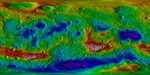 This color-coded topography map from NASA's Dawn mission shows the giant asteroid Vesta in an equirectangular projection at 32 pixels per degree, relative to an ellipsoid of 177 miles by 177 miles by 142 miles (285 kilometers by 285 kilometers by 229 kilometers). The color scale extends from 13.96 miles (22.47 kilometers) below the surface in purple to 12.11 miles (19.48 kilometers) above the surface in white. The topographic map was constructed from analyzing more than 17,000 images from Dawn's framing camera that were taken with varying sun and viewing angles.