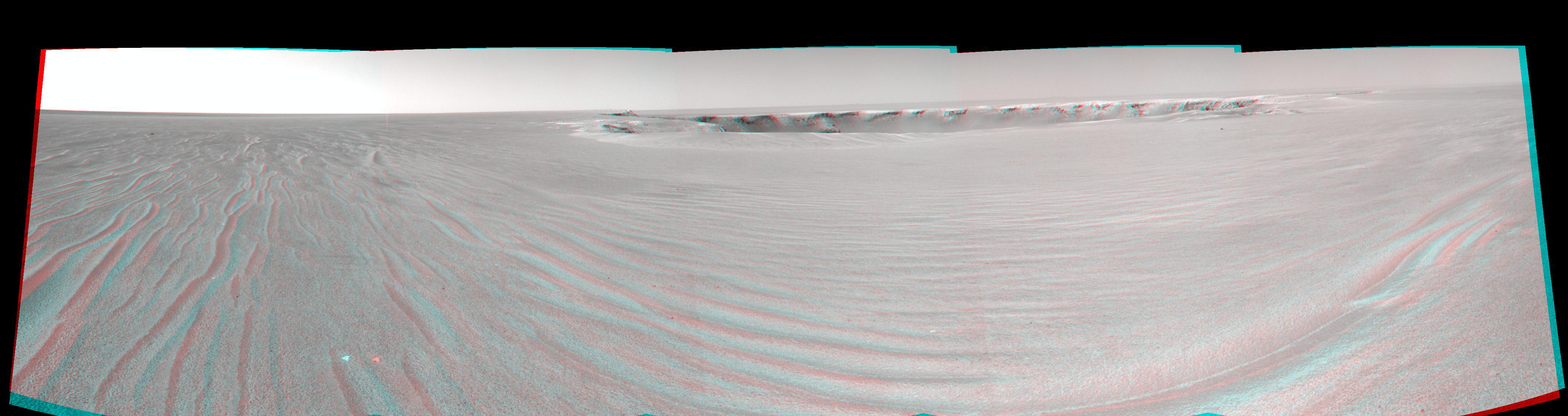 A drive of about 30 meters (about 100 feet) on the 950th Martian day, or sol, of Opportunity's exploration of Mars' Meridiani Planum region (Sept. 25, 2006) brought the NASA rover to within about 20 meters (about 66 feet) of the rim of "Victoria Crater." From that position, the rover's navigation camera took the exposures combined into this stereo anaglyph, which appears three-dimensional when viewed through red-green glasses. The scalloped shape of the crater is visible on the left edge. Due to a small dune or ripple close to the nearest part of the rim, the scientists and engineers on the rover team planned on sol 951 to drive to the right of the ripple, but not quite all the way to the rim, then to proceed to the rim the following sol. The image is presented in cylindrical projection with geometric seam correction.