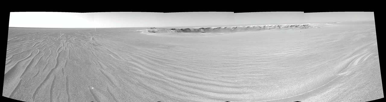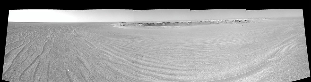 Victoria Crater is about 800 meters (one-half mile) in diameter, about five times wider than "Endurance Crater," which Opportunity spent six months examining in 2004, and about 40 times wider than "Eagle Crater," where Opportunity first landed. The great lure of Victoria is the expectation that a thick stack of geological layers will be exposed in the crater walls, potentially several times the thickness that was previously studied at Endurance and therefore, potentially preserving several times the historical record.