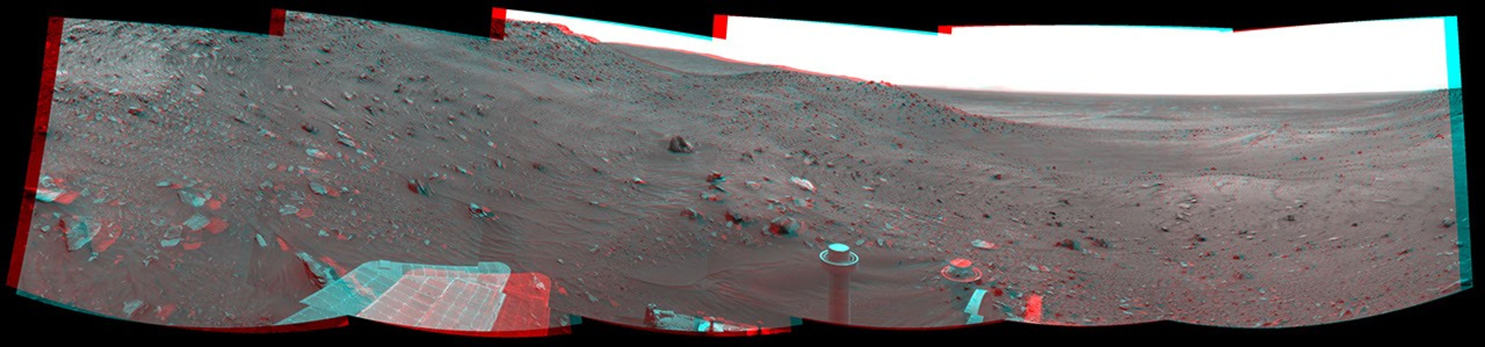 This view combines images from the left-eye and right-eye sides of the navigation camera. It appears three-dimensional when viewed through red-blue glasses with the red lens on the left.