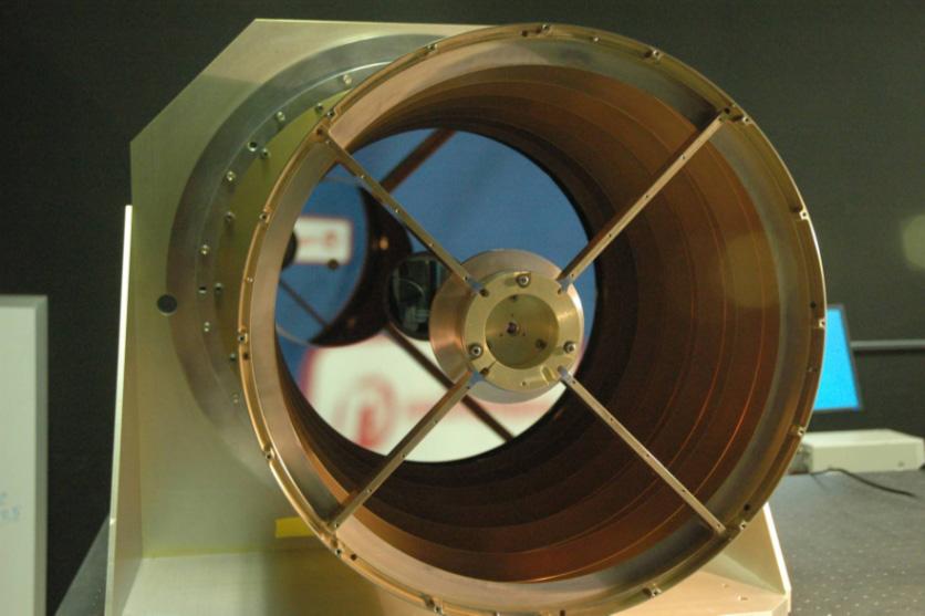 View looking down the barrel of the Wide-field Infrared Survey Explorer, or WISE, telescope. This image shows the 40 cm WISE primary mirror, which is the largest optical element in the WISE system. This image shows the initial assembly of the optics. After this initial check-out, the optical system will be disassembled for painting and the aluminum mirrors will be given a thin Gold coating. Gold is a good reflector in the infrared and is often used to coat IR optics.