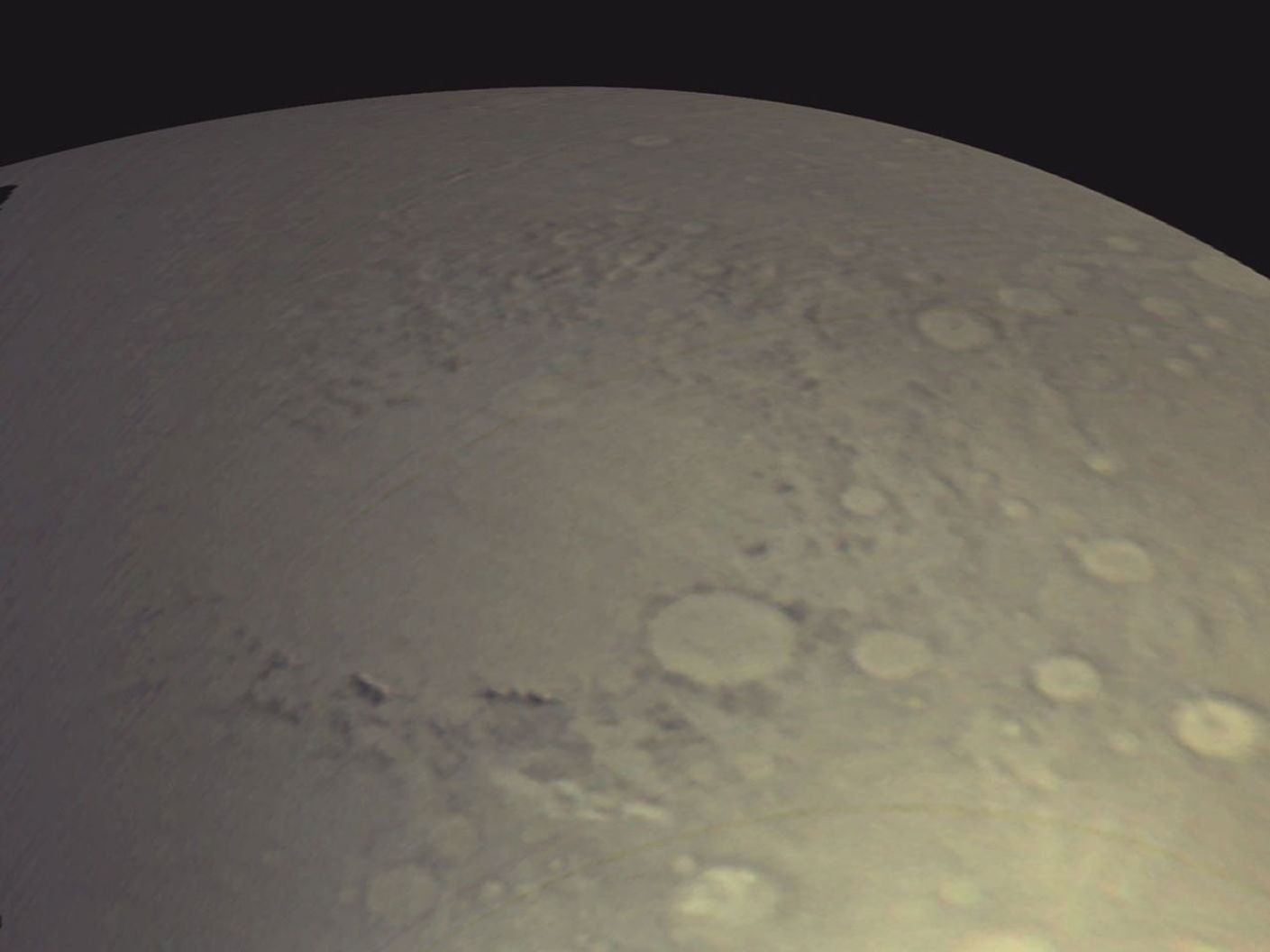 The color composite from MARCI differs from the MOC wide-angle color composite because, to create a color image with MOC data, camera-team members synthesize (fake) a green channel by adding the red and blue channels together and dividing by two. The slightly greenish tint of the MARCI image shows that the approximation used for MOC images underestimates the amount of green.