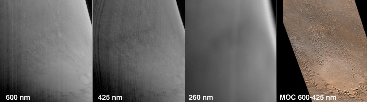The test image labeled 260 nm shows how the planet appears at an ultraviolet (UV) waveband of 260 nanometers, where ozone absorbs the UV light. Relatively darker areas in this band normally will indicate the presence of ozone, and relatively lighter areas will indicate the absence of ozone. Water vapor in Mars' atmosphere is in an inverse relationship with ozone; where there is more of one, there is less of the other. So, lighter areas in images can be used to track water vapor. The term "relatively" is used here because Mars itself is very dark in the UV owing to absorption of UV light by iron-bearing minerals, and sunlight is deficient in UV relative to visible light, so in general Mars will always look dark in the UV. A second UV band on MARCI (not shown in the figure above) at a longer wavelength allows these differences to be quantified. The MOC wide-angle image shows wispy, light water-ice clouds to the northwest of Argyre in the afternoon, but researchers cannot yet correlate these clouds with the UV information from MARCI, especially because the times of day are different. When in its final mapping orbit, Mars Reconnaissance Orbiter will view the same area as Mars Global Surveyor separated by only one hour, and such correlations will be much more direct.