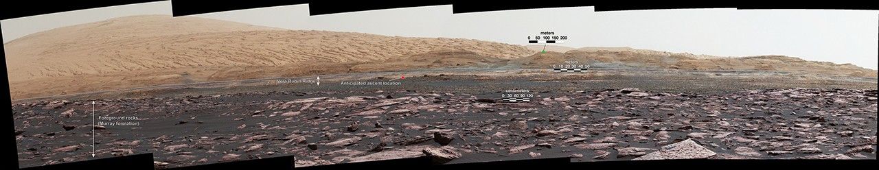 Figure 1 is an annotated version of the scene. On it, the dotted white line traces the top of the ridge, a red dot indicates the anticipated route to the top of the ridge, and scale bars indicate dimensions at different distances from the rover. The nearest scale bar, in centimeters, refers to ground about 90 feet (27 meters) away from the camera, in the Murray formation outcrop. The middle and farthest scale bars, in meters, refer to features at distances of about 1,000 yards (900 meters) on Vera Rubin Ridge and about 2.1 miles (3.4 kilometers) in the Sulfate Unit.