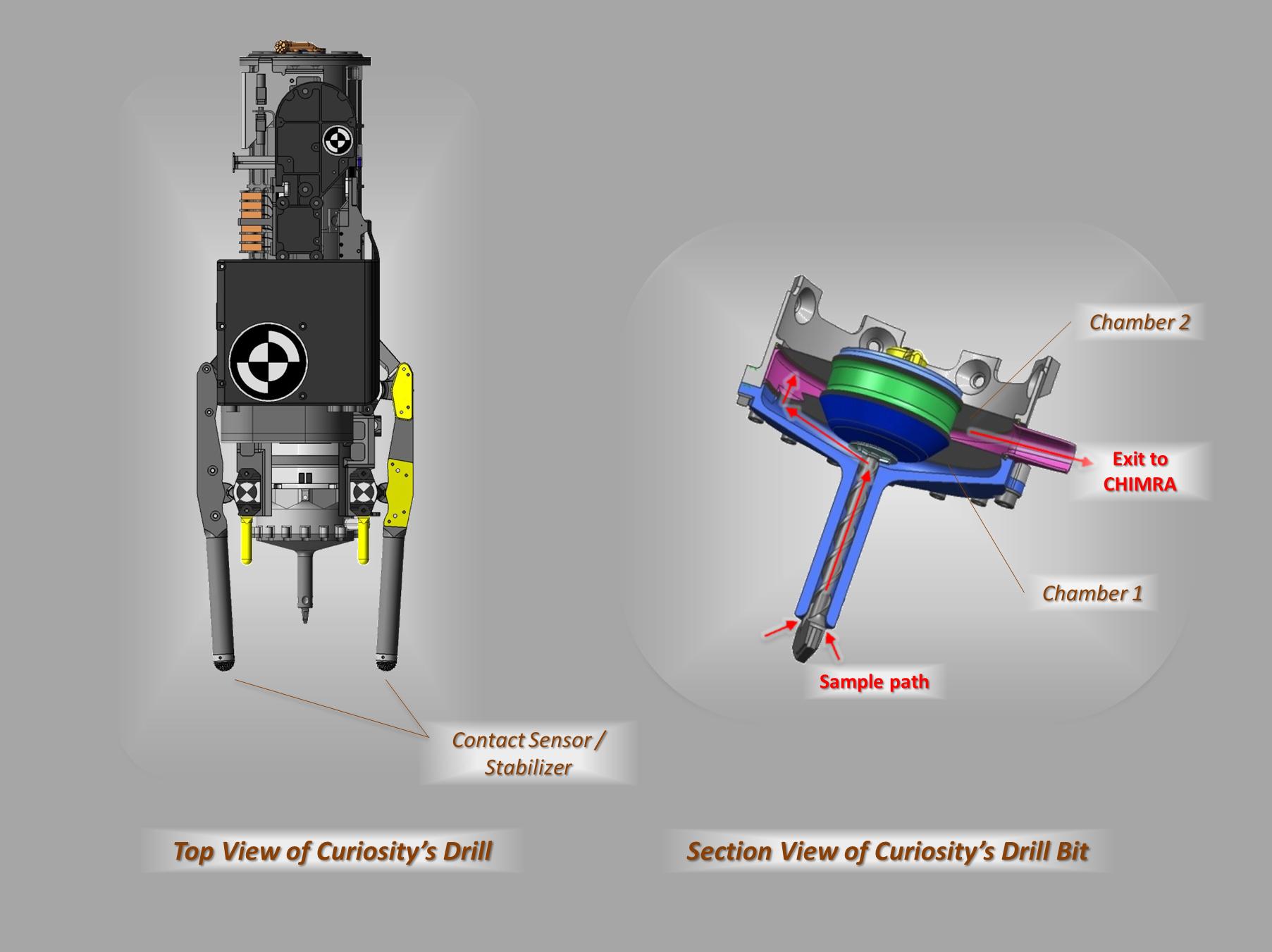 These schematic drawings show a top view and a cutaway view of a section of the drill on NASA's Curiosity rover on Mars. The section view on the right also indicates the flow of material within the drill bit.