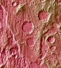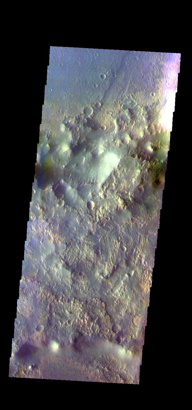 The THEMIS VIS camera contains 5 filters. The data from different filters can be combined in multiple ways to create a false color image. These false color images may reveal subtle variations of the surface not easily identified in a single band image. Today's false color image shows the southeastern floor and rim of Virrat Crater (top of image), and the northern rim of Wukari Crater (bottom of image). These craters are located in Claritas Fossae.