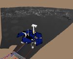 This image shows a screenshot from the software used by engineers to roll the Mars Exploration Rover Opportunity off its lander and onto martian soil. Engineers received confirmation that Opportunity's six wheels had touched ground at 3:01 a.m. PST, January 31, 2004, on the seventh martian day, or sol, of the mission. The software simulates the rover's movements, helping to plot a safe course. The virtual 3-D world around the rover is built from images taken by Opportunity's stereo navigation cameras. Regions for which the rover has not yet acquired 3-D data are represented in beige. The rover is approximately 1 meter (3 feet) in front of the lander, facing north.