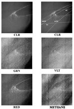 Although Jupiter's aurora had been imaged from Earth in the ultraviolet and infrared, these are the first images at visible wavelengths, where most of the emission takes place. CLR stands for clear (no filter) and shows the integrated brightness at all wavelengths. The other panels show the violet, green, red, and 889 nanometer-wavelength filtered images. The brightness of the aurora is roughly independent of wavelength, at least at the spectral resolution obtainable with these filters.
