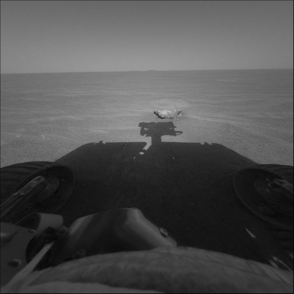 This image from the Mars Exploration Rover Opportunity's front hazard-avoidance camera focuses on the rock dubbed "Bounce," which the rover's airbag-wrapped lander hit upon landing. Though the plains surrounding Opportunity's "Eagle Crater" landing site are relatively free of any hazards that would have hindered landing, the packaged rover managed to bounce down on one of the only rocks in the vicinity. The rock measures approximately 40 centimeters (about 16 inches) across.