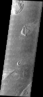 Note: this THEMIS visual image has not been radiometrically nor geometrically calibrated for this preliminary release. An empirical correction has been performed to remove instrumental effects. A linear shift has been applied in the cross-track and down-track direction to approximate spacecraft and planetary motion. Fully calibrated and geometrically projected images will be released through the Planetary Data System in accordance with Project policies at a later time.
