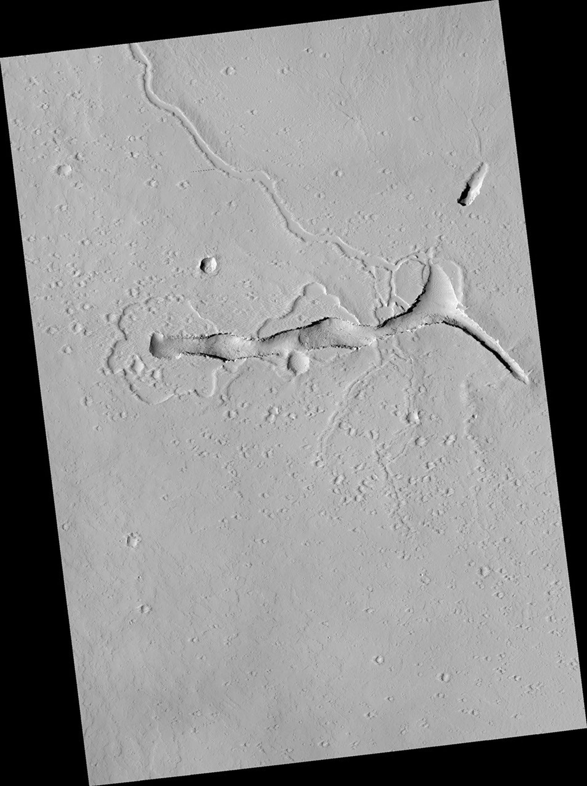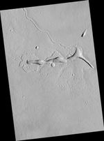 rise is riddled with faults and fractures. The area depicted in the sub-image (above) lies between three sets of fractures -- the Cyane Fossae, the Ceraunius Fossae, and the Olympic Fossae -- and on the flank of a low volcanic shield. The prominent trough in the HiRISE image is a volcanic vent.