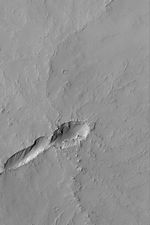 The volcanic plains to the east, southeast, and south of the giant Tharsis volcano, Pavonis Mons, are dotted by dozens of small volcanoes. This Mars Global Surveyor (MGS) Mars Orbiter Camera (MOC) image shows an example located near 2.1°S, 109.1°W. The elongate depression in the lower left (southwest) quarter of the image is the collapsed vent area for this small, unnamed volcano. A slightly sinuous, leveed channel runs from the depression toward the upper right (north-northeast); this is the trace of a collapsed lava tube. The entire scene has been mantled by dust, such that none of the original volcanic rocks are exposed--except minor occurrences on the steepest slopes in the vent area. The scene is 3 km (1.9 mi) wide and illuminated by sunlight from the left/upper left.